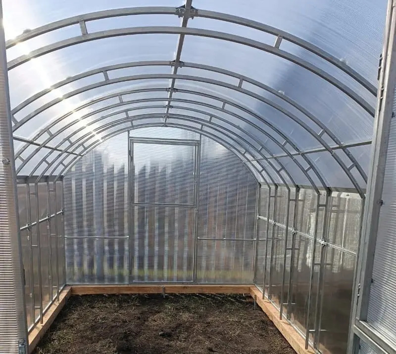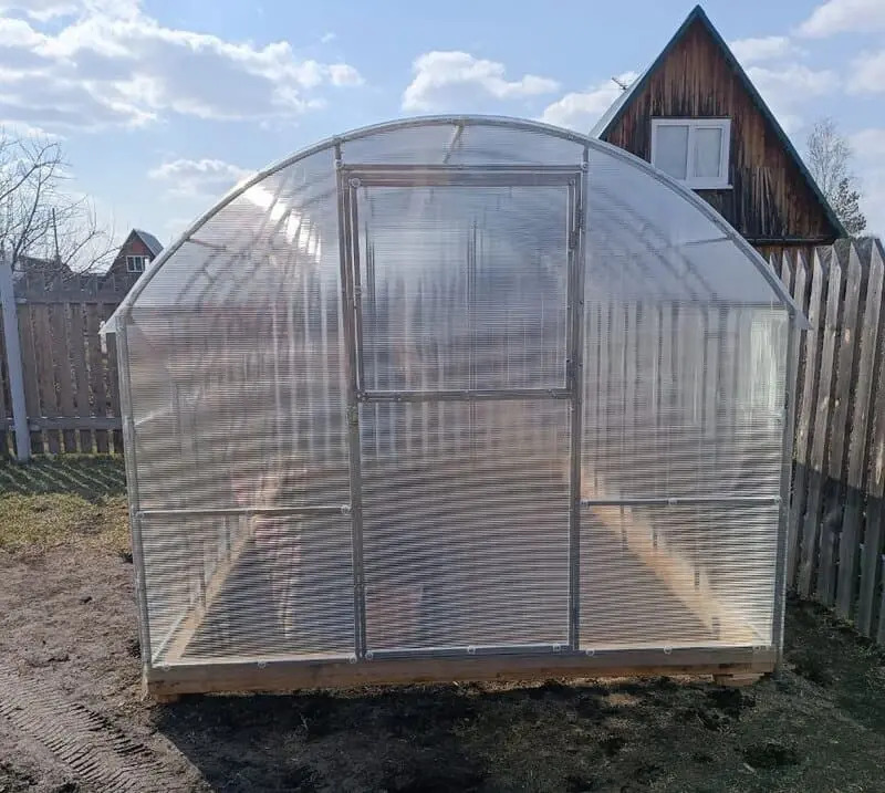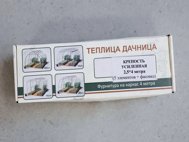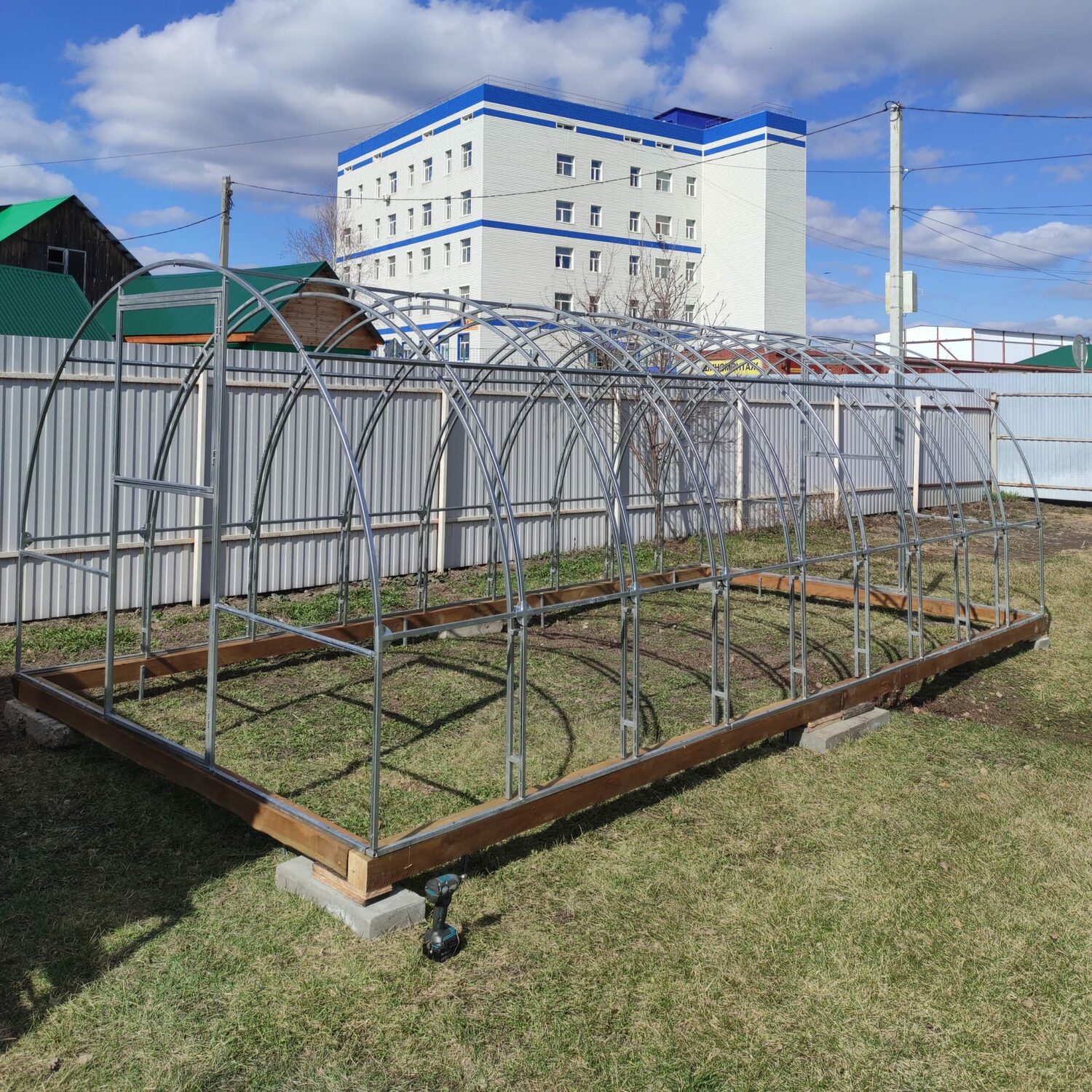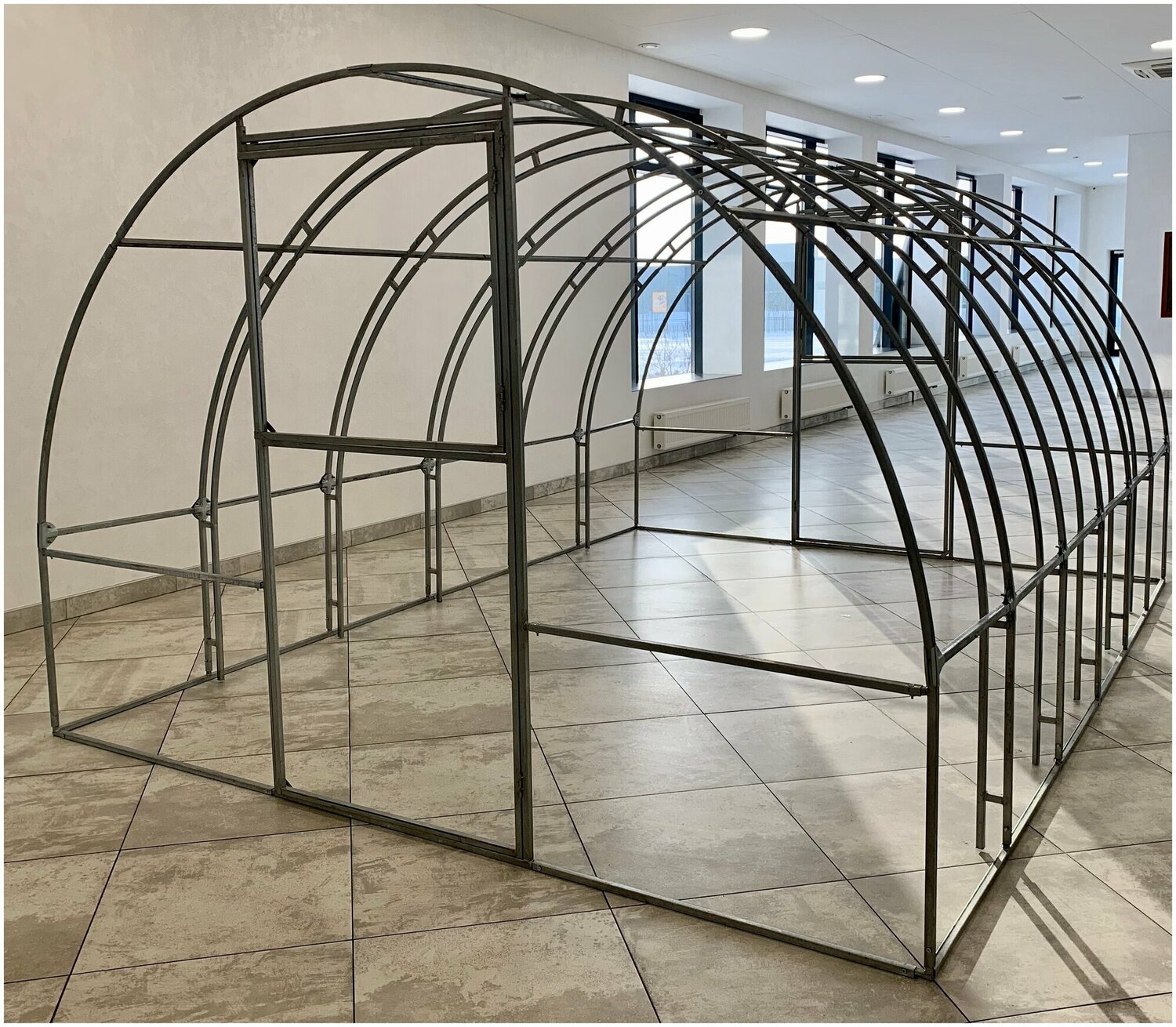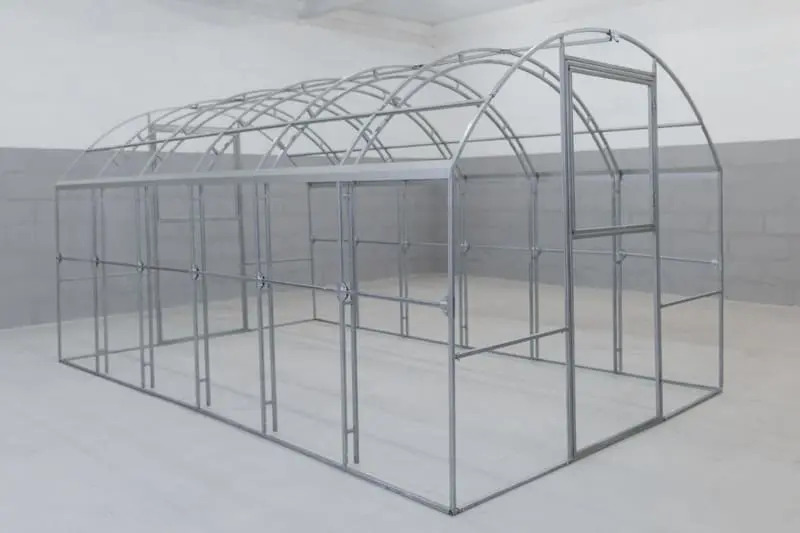 Теплица шириной 2,5 метра и высотой 2,2 метра имеет стенки высотой 1,5 метра, что обеспечивает удобную рабочую зону по всей площади. Длина конструкции варьируется от 4 до 8 метров и более, увеличивается с шагом в 2 метра. Каркас выполнен из оцинкованной трубы сечением 20×20 мм, защищённой от коррозии как снаружи, так и изнутри — не требует покраски. Усиленные двойные дуги, расстояние между ними составляет 65 сантиметров. соединены между собой дополнительными перемычками, что повышает прочность конструкции. Сборка осуществляется по системе труба в трубу с применением крабовых соединений. В торцах теплицы расположены две двери с широкими форточками для проветривания. В комплект входит вся необходимая фурнитура: болты, ручки и замки для дверей и окон, а также два крючка для фиксации дверей. Каркас дополнительно усилен семью продольными соединительными элементами.