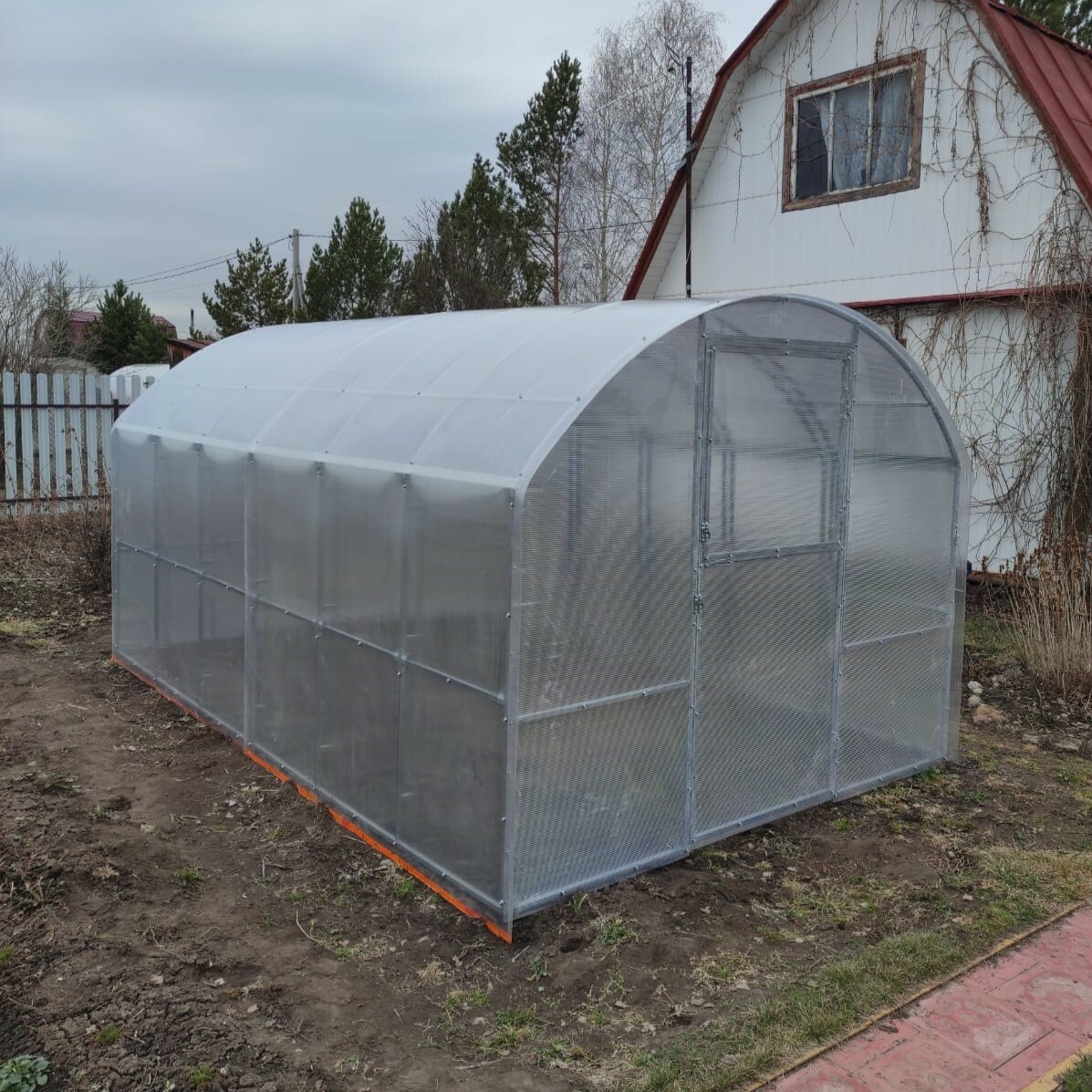 Теплица шириной 2,5 метра и высотой 2,2 метра удобна в работе благодаря стенкам высотой 1,5 метра. Длина теплицы от 4 метров с шагом в 2 метра, в зависимости от потребностей. Каркас теплицы сделан из оцинкованной трубы 20×20 мм. Покрытие защищает его от коррозии как снаружи, так и внутри, поэтому покраска не требуется. Двойные дуги расположены с шагом в 1 метр. Сборка теплицы простая и надежная, используется система "труба в трубу" с крабовыми соединениями. На торцах находятся две двери с широкими форточками для вентиляции. Конструкция усилена семью продольными элементами. В комплект входят все нужные крепежные детали: болты, ручки, замки для дверей и окон, а также два крючка для фиксации дверей.
